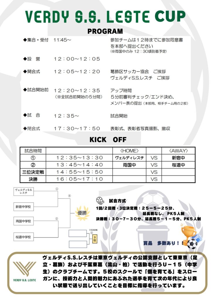 7/28(日)葛飾区にいじゅくみらい公園多目的広場にて中学校部活サッカー部を対象とした「ヴェルディS.S.レスチカップ 部活Kリーグワンデイ2024」を開催致します。