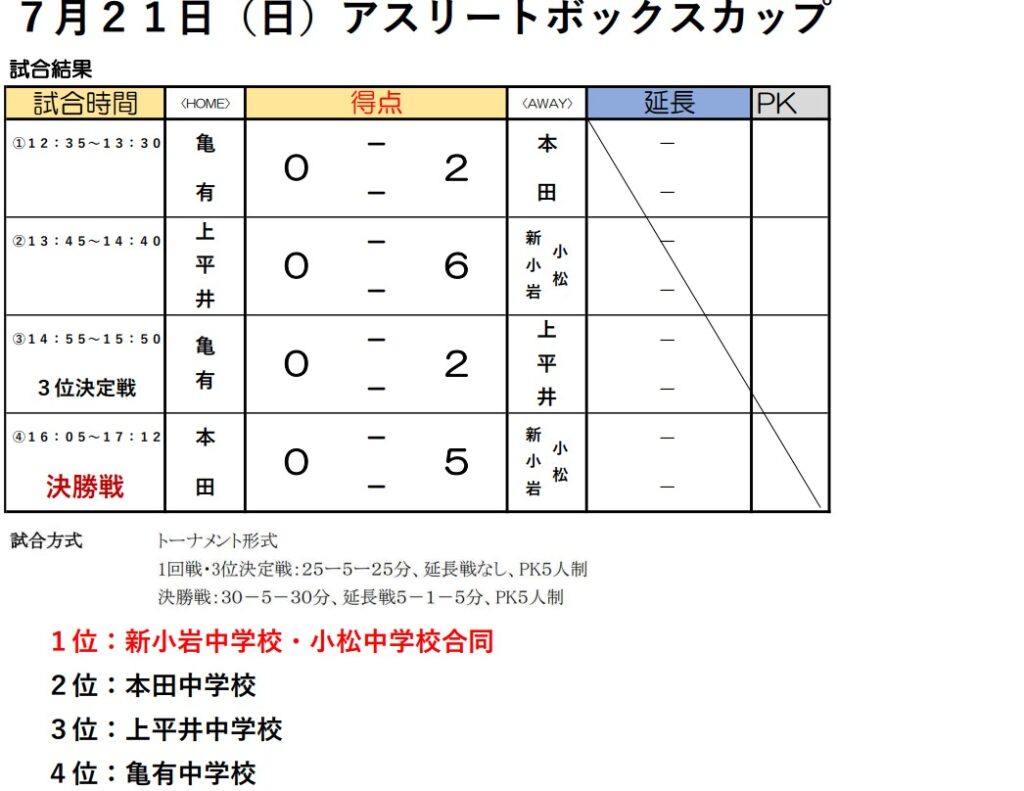 7/21(日)「アスリートボックスカップ 部活Kリーグワンデイ2024」の試合結果をお知らせいたします。