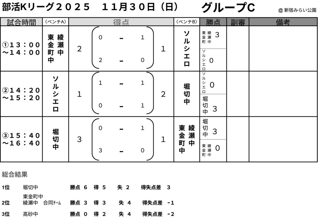 「第3回 部活Kリーグ2025」11月30日(日)大会、試合結果のご報告です。